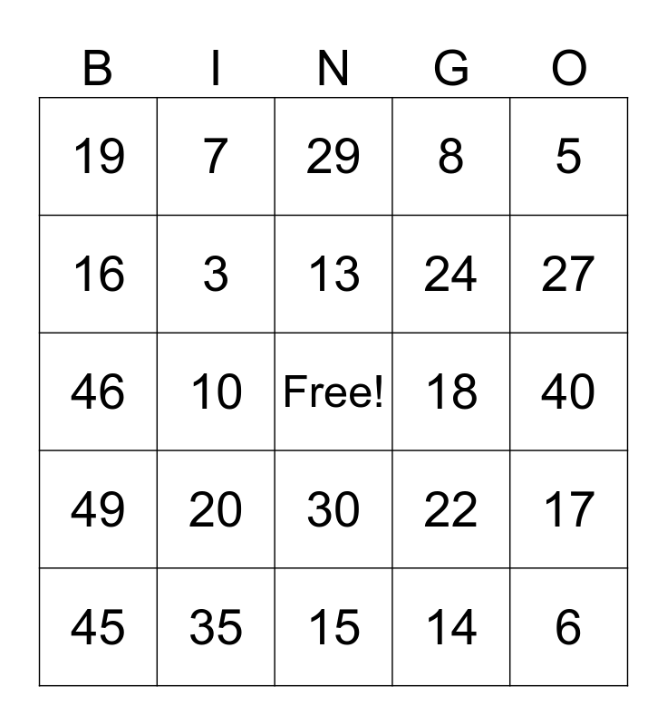 This bingo card has a free space and 50 words: 1, 6, 11, 15, 20, 2, 7, 12, 16, 21, 3, 8, 17, 22, 4, 9, 13, 18, 23, 5, 10, 14, 19, 24, 25, 26, 27, 28, 29, 30, 31, 32, 33, 34, 35, 36, 37, 38, 39, 40, 41, 42, 43, 44, 45, 46, 47, 48, 49 and 50.
