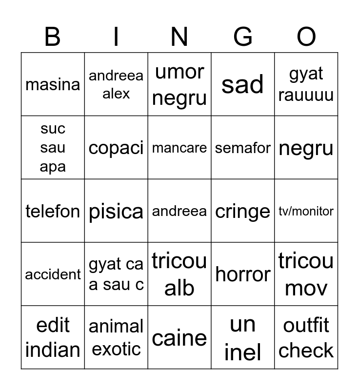 This bingo card has a free space and 24 words: gyat ca a sau c, animal exotic, mancare, edit indian, gyat rauuuu, masina, suc sau apa, andreea alex, cringe, tricou alb, semafor, telefon, horror, tricou mov, copaci, un inel, tv/monitor, umor negru, negru, pisica, outfit check, accident, sad and caine.