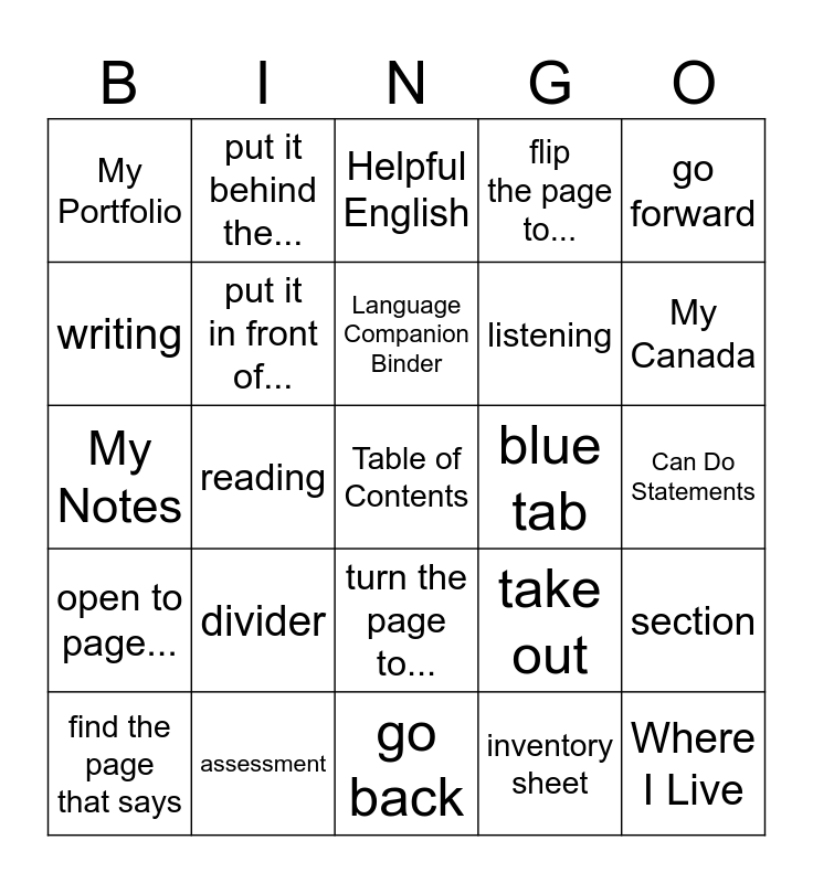 This bingo card has a free space and 28 words: section, orange tab, listening, inventory sheet, writing, Helpful English, put it behind the..., open to page..., blue tab, find the page that says, My Notes, flip the page to..., assessment, go back, My Canada, binder, divider, put it in front of..., Language Companion Binder, turn the page to..., My Portfolio, speaking, Where I Live, reading, Can Do Statements, take out, go forward and blue tab.