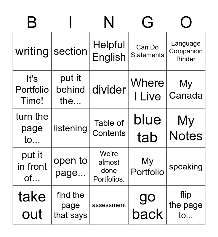 This bingo card has a free space and 29 words: take out, orange tab, listening, inventory sheet, writing, Helpful English, put it behind the..., open to page..., blue tab, find the page that says, My Notes, flip the page to..., assessment, go back, My Canada, binder, We're almost done Portfolios., put it in front of..., Language Companion Binder, turn the page to..., My Portfolio, go forward, Where I Live, It's Portfolio Time!, Can Do Statements, section, speaking, divider and reading.