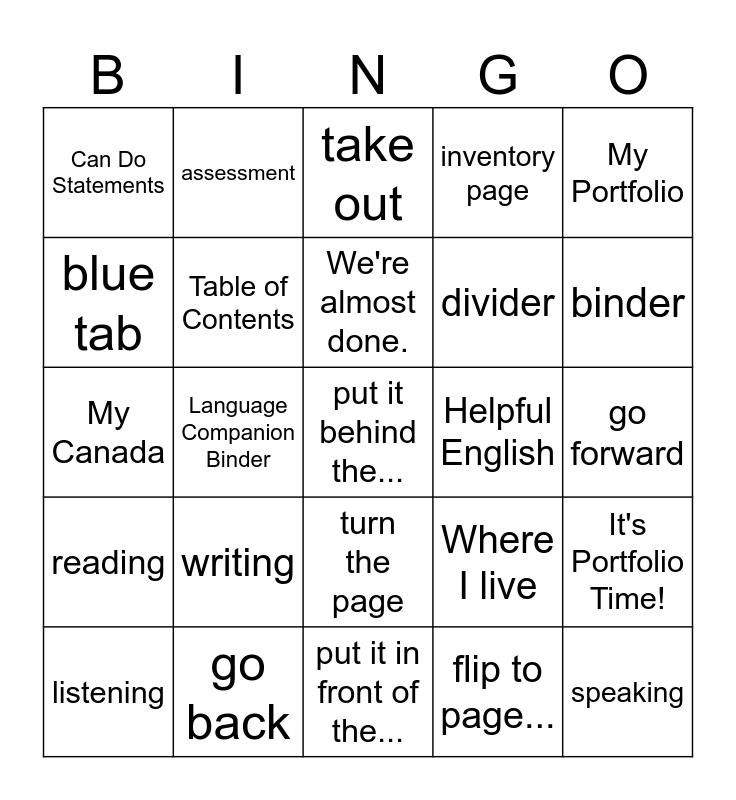 This bingo card has a free space and 29 words: listening, open to page..., Language Companion Binder, My Notes, Can Do Statements, take out, Table of Contents, writing, Helpful English, go back, go forward, speaking, put it in front of the..., flip to page..., binder, orange tab, turn the page, reading, My Portfolio, My Canada, Where I live, section, divider, blue tab, inventory page, assessment, It's Portfolio Time!, We're almost done. and find the page that says....