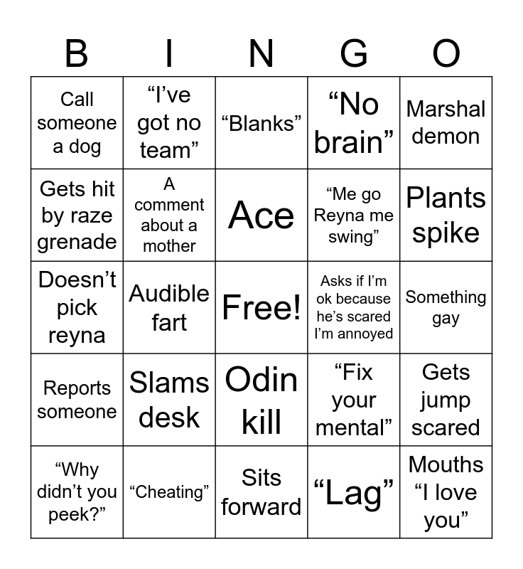 This bingo card has a free space and 24 words: Slams desk, “Cheating”, Ace, “Why didn’t you peek?”, Marshal demon, Call someone a dog, Gets hit by raze grenade, “I’ve got no team”, Asks if I’m ok because he’s scared I’m annoyed, Odin kill, “Me go Reyna me swing”, Doesn’t pick reyna, “Fix your mental”, Gets jump scared, A comment about a mother, “Lag”, Something gay, “Blanks”, Plants spike, Audible fart, Mouths “I love you”, Reports someone, “No brain” and Sits forward.