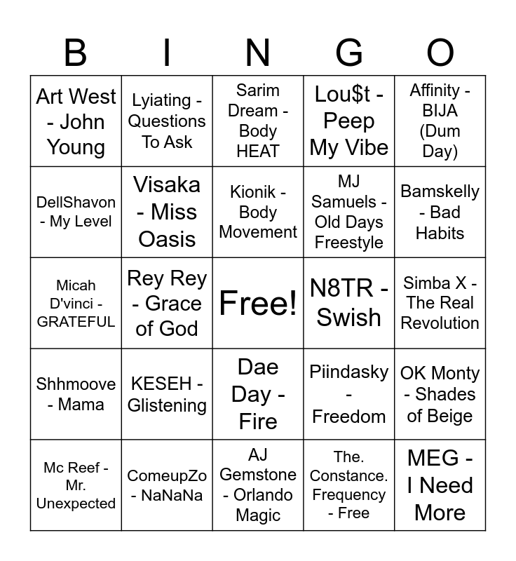 This bingo card has a free space and 24 words: KESEH - Glistening, ComeupZo - NaNaNa, Kionik - Body Movement, Mc Reef - Mr. Unexpected, Affinity - BIJA (Dum Day), Art West - John Young, DellShavon - My Level, Lyiating - Questions To Ask, N8TR - Swish, Dae Day - Fire, MJ Samuels - Old Days Freestyle, Micah D'vinci - GRATEFUL, Piindasky - Freedom, OK Monty - Shades of Beige, Visaka - Miss Oasis, The. Constance. Frequency - Free, Simba X - The Real Revolution, Sarim Dream - Body HEAT, Bamskelly - Bad Habits, Rey Rey - Grace of God, MEG - I Need More, Shhmoove - Mama, Lou$t - Peep My Vibe and AJ Gemstone - Orlando Magic.