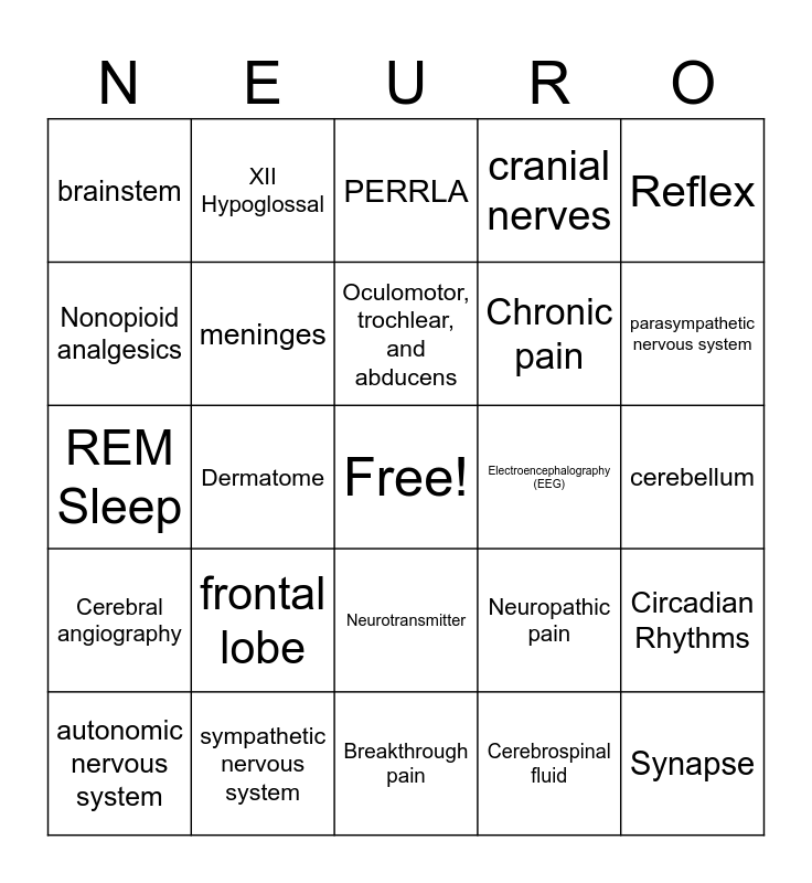 This bingo card has a free space and 27 words: Neuropathic pain, Acute pain, Chronic pain, Breakthrough pain, Nonopioid analgesics, PERRLA, XII Hypoglossal, Cerebral angiography, Electroencephalography (EEG), Circadian Rhythms, REM Sleep, cranial nerves, autonomic nervous system, sympathetic nervous system, parasympathetic nervous system, blood-brain barrier, meninges, Oculomotor, trochlear, and abducens, frontal lobe, brainstem, cerebellum, Cerebrospinal fluid, Dermatome, Synapse, Neurotransmitter, Reflex and Cerebrum.
