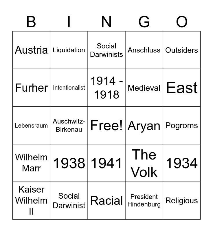 This bingo card has a free space and 54 words: Mein Kampf, Wilhelm Marr, Anti-Semitism, 1939, 1941, Operation Barbarossa, Anschluss, Appeasement, Furher, Bavarian, Austria, Houston Stewart Chamberlain, Social Darwinist, Kaiser Wilhelm II, Weimar Republic, Racial, Religious, Medieval, Enlightenment, Pogroms, The Volk, On the Origin of Species, Aryan, Outsiders, Nuremberg Laws, Liquidation, Expropriation, Ideology, German Worker's Party, President Hindenburg, "Stabbed in the back", "November Criminals", Enemy, National Socialist German Worker's Party, Social Darwinists, 1925, Lebensraum, 1934, Treaty of Versailles, Intentionalist, Functionalist, Protocols of the Elders of Zion, Propaganda, 'the longest hatred', 1938, 1944, Stalingrad, Start of the Holocaust, 1914 - 1918, Auschwitz-Birkenau, East, Beer Hall Putsch, Marxists and Nationalism.