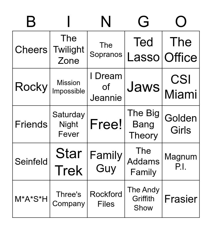 This bingo card has a free space and 34 words: Hawaii Five-0, The Andy Griffith Show, Welcome Back Kotter, Game of Thrones, Seinfeld, Mission Impossible, The Office, M*A*S*H, The Twilight Zone, The Brady Bunch, I Dream of Jeannie, The Sopranos, Stranger Things, The Partridge Family, The Big Bang Theory, CSI Miami, Three's Company, Friends, Star Trek, The Addams Family, Family Guy, The Flintstones, Cheers, Golden Girls, Rockford Files, Frasier, Ted Lasso, The Good, the Bad & the Ugly, Jaws, Rocky, Footloose, Saturday Night Fever, Magnum P.I. and The Pink Panther.