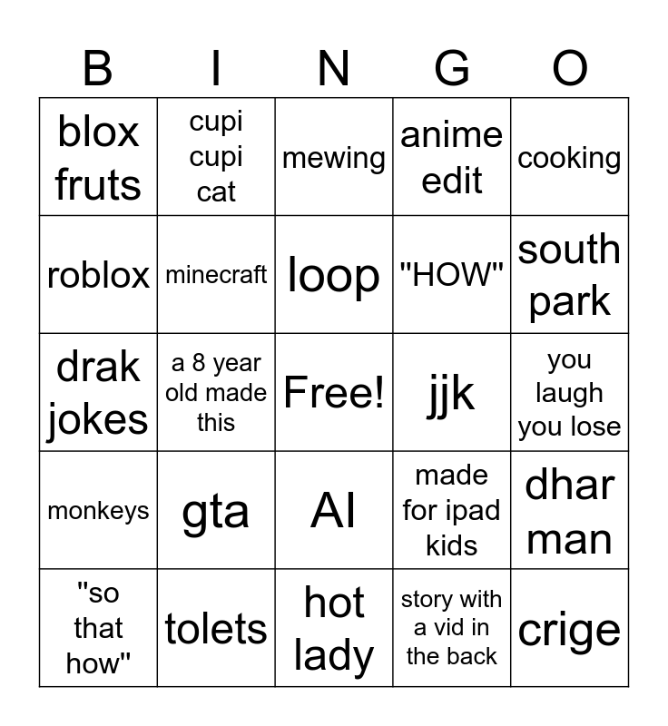 This bingo card has a free space and 24 words: ''so that how'', gta, loop, story with a vid in the back, cooking, blox fruts, cupi cupi cat, mewing, jjk, you laugh you lose, drak jokes, minecraft, made for ipad kids, dhar man, roblox, tolets, hot lady, anime edit, south park, monkeys, a 8 year old made this, AI, ''HOW'' and crige.