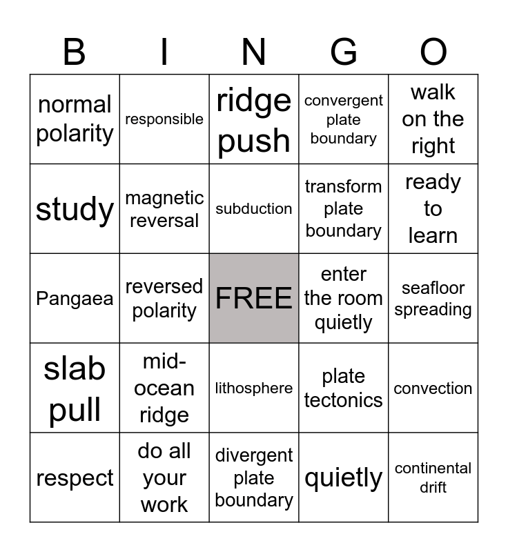 This bingo card has a free space and 24 words: mid-ocean ridge, do all your work, subduction, respect, walk on the right, normal polarity, study, responsible, enter the room quietly, lithosphere, transform plate boundary, Pangaea, plate tectonics, convection, magnetic reversal, quietly, seafloor spreading, ridge push, ready to learn, reversed polarity, continental drift, slab pull, convergent plate boundary and divergent plate boundary.
