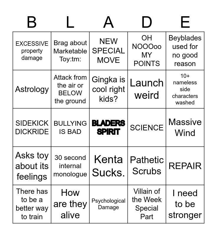 This bingo card has a free space and 24 words: 30 second internal monologue, How are they alive, Gingka is cool right kids?, There has to be a better way to train, Beyblades used for no good reason, EXCESSIVE property damage, Astrology, Brag about Marketable Toy:tm:, SCIENCE, Kenta Sucks., Launch weird, SIDEKICK DICKRIDE, Pathetic Scrubs, REPAIR, Attack from the air or BELOW the ground, Villain of the Week Special Part, Massive Wind, NEW SPECIAL MOVE, 10+ nameless side characters washed, BULLYING IS BAD, I need to be stronger, Asks toy about its feelings, OH NOOOoo MY POINTS and Psychological Damage.