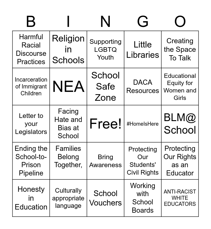 This bingo card has a free space and 24 words: Families Belong Together,, Culturally appropriate language, School Safe Zone, Honesty in Education, Creating the Space To Talk, Harmful Racial Discourse Practices, Incarceration of Immigrant Children, Religion in Schools, #HomeIsHere, Bring Awareness, DACA Resources, Letter to your Legislators, Protecting Our Students' Civil Rights, Protecting Our Rights as an Educator, NEA, Working with School Boards, BLM@ School, Supporting LGBTQ Youth, Educational Equity for Women and Girls, Facing Hate and Bias at School, ANTI-RACIST WHITE EDUCATORS, Ending the School-to-Prison Pipeline, Little Libraries and School Vouchers.