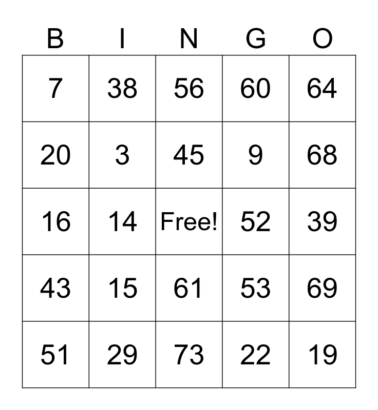 This bingo card has a free space and 24 words: 15, 29, 45, 51, 64, 7, 20, 38, 52, 61, 9, 16, 53, 69, 3, 22, 39, 56, 68, 14, 19, 43, 60 and 73.