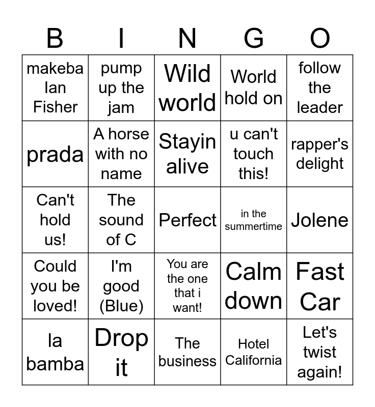 This bingo card has a free space and 24 words: I'm good (Blue), Drop it, Stayin alive, la bamba, follow the leader, makeba Ian Fisher, prada, pump up the jam, in the summertime, You are the one that i want!, u can't touch this!, Can't hold us!, Calm down, Fast Car, A horse with no name, Hotel California, Jolene, Wild world, rapper's delight, The sound of C, Let's twist again!, Could you be loved!, World hold on and The business.