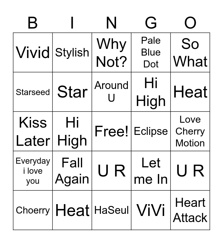 This bingo card has a free space and 94 words: HeeJin, HyunJin, HaSeul, YeoJin, ViVi, Kim Lip, JinSoul, Choerry, Yves, Chuu, GoWon, Hyeju, favourite, Hi High, Butterfly, So What, Why Not?, Paint the Town, Flip That, Hula Hoop, Luminous, Starseed, Pose, Where you At?, Fall Again, Star, Universe, Pale Blue Dot, Wow, Dance on my Own, Heat, U R, Ding Ding Dong, Number 1, Stylish, Singing in the Rain, Eclipse, Vivid, Around U, Let me In, Kiss Later, Everyday i love you, Love Cherry Motion, new, Heart Attack, One & Only, Egoist, HeeJin, HyunJin, HaSeul, YeoJin, ViVi, Kim Lip, JinSoul, Choerry, Yves, Chuu, GoWon, Hyeju, favourite, Hi High, Butterfly, So What, Why Not?, Paint the Town, Flip That, Hula Hoop, Luminous, Starseed, Pose, Where you At?, Fall Again, Star, Universe, Pale Blue Dot, Wow, Dance on my Own, Heat, U R, Ding Ding Dong, Number 1, Stylish, Singing in the Rain, Eclipse, Vivid, Around U, Let me In, Kiss Later, Everyday i love you, Love Cherry Motion, new, Heart Attack, One & Only and Egoist.