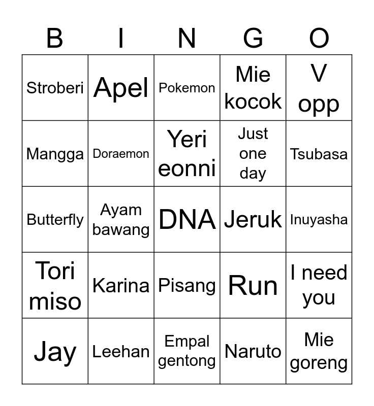 This bingo card has a free space and 24 words: Karina, Leehan, Yeri eonni, Jay, V opp, Stroberi, Mangga, Apel, Jeruk, Pisang, Just one day, Butterfly, Run, I need you, Doraemon, Naruto, Inuyasha, Pokemon, Tsubasa, Ayam bawang, Mie goreng, Tori miso, Mie kocok and Empal gentong.
