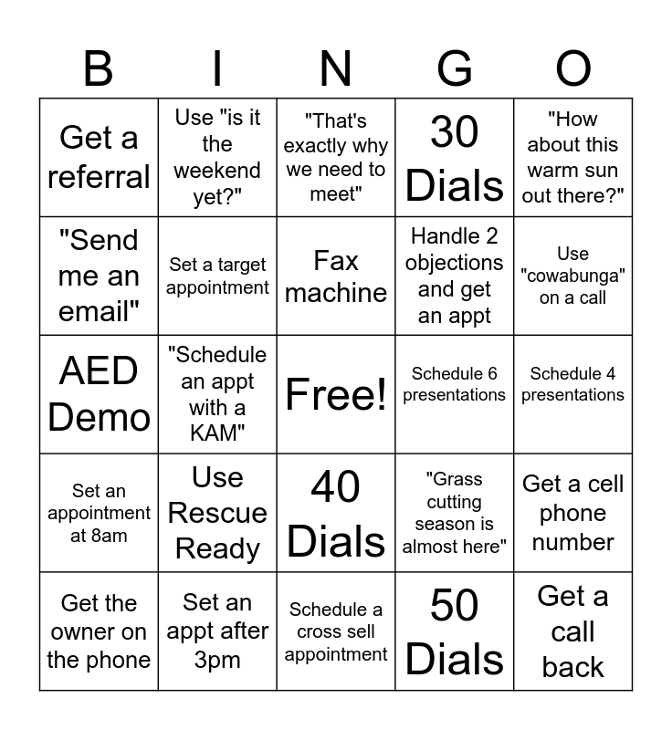 This bingo card has a free space and 24 words: Use Rescue Ready, Set an appt after 3pm, Fax machine, Get the owner on the phone, "How about this warm sun out there?", Get a referral, "Send me an email", Use "is it the weekend yet?", Schedule 6 presentations, 40 Dials, Handle 2 objections and get an appt, AED Demo, "Grass cutting season is almost here", Get a cell phone number, Set a target appointment, 50 Dials, Schedule 4 presentations, "That's exactly why we need to meet", Use "cowabunga" on a call, "Schedule an appt with a KAM", Get a call back, Set an appointment at 8am, 30 Dials and Schedule a cross sell appointment.