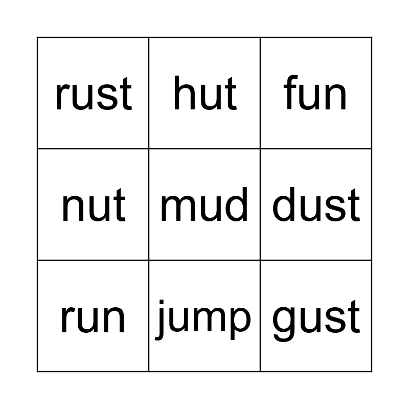 This bingo card has a free space and 9 words: run, fun, hut, nut, rust, dust, gust, lump and jump.