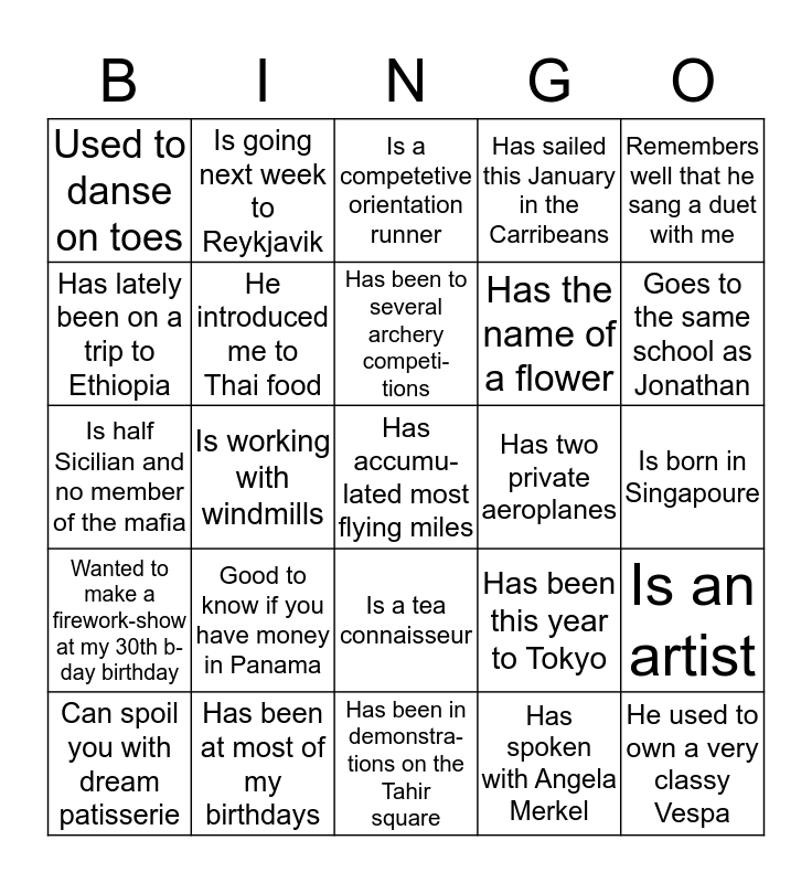 This bingo card has 25 words: Good to know if you have money in Panama, Has been in demonstra- tions on the Tahir square, Has been to several archery competi- tions, Can spoil you with dream patisserie, Remembers well that he sang a duet with me, Used to danse on toes, Has lately been on a trip to Ethiopia, Is going next week to Reykjavik, Has two private aeroplanes, Is a tea connaisseur, Has the name of a flower, Is half Sicilian and no member of the mafia, Has been this year to Tokyo, Is an artist, He introduced me to Thai food, He used to own a very classy Vespa, Is born in Singapoure, Is a competetive orientation runner, Goes to the same school as Jonathan, Is working with windmills, Has accumu- lated most flying miles, Has been at most of my birthdays, Wanted to make a firework-show at my 30th b-day birthday, Has sailed this January in the Carribeans and Has spoken with Angela Merkel.