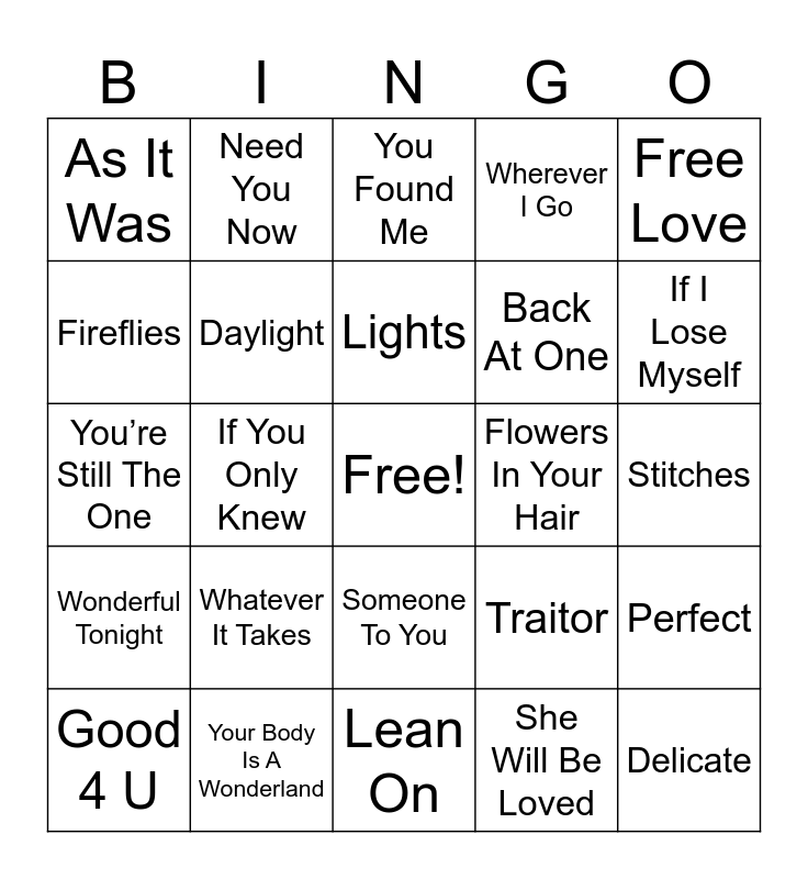 This bingo card has a free space and 150 words: Lucky, Bubbly, I Won’t Give Up, You All Over Me, Butterflies, Stay, Stay With Me, Best Of My Love, How Deep is Your Love, Time After Time, I’ll Make Love To You, You And Me, Back At One, Won’t Go Home Without You, Daylight, What A Feeling, The Scientist, I Can Feel You Breathe, Put Your Records On, Falling Slowly, I’ll Stand By You, Make You Mine, All My Life, I Love You Always Forever, Hold On, We’re Going Home, If I Ain’t Got You, Lay Me Down, Flowers In Your Hair, Sister Golden Hair, Ghost, She Will Be Loved, Angel Baby, Hello My Love, Crimson and Clover, Can’t Take My Eyes Off of You, Can’t Get Enough of Your Love, Someone You Loved, Kiss Me, Delicate, Everlasting Love, Halo, Your Song, Free Love, Just The Two Of Us, I Knew I Loved You, Mess Is Mine, So It Goes, Collide, Wonderful Tonight, Lovefool, Earned It, Someone To You, You’re Still The One, Dedicated To The One I Love, This Is Heaven, Just The Way You Are, Electric Love, Whatcha Say, Fire and the Flood, Rhythm of Love, Lay It All On Me, Whatever It Takes, Fireflies, X, Really Don’t Care, Wherever I Go, Need You Now, I Knew You Were Trouble, Turn The Car Around, Lean On, Traitor, Precious Love, Next To Me, Shadow of the Day, Best Day Of My Life, Unwritten, Part Of Me, Attention, Lights, Pompeii, Big Girls Don’t Cry, It’s Time, Love Story, The Middle, Stitches, Drivers License, Bad Habits, Send My Love, Crazy, All My Favorite Songs, Everybody, Scars To Your Beautiful, Falling In, No One, Prisoner, I Lived, All You Wanted, Someday, Running Up That Hill, Midnight Sky, Better In Time, Never Really Over, Good Grief, If I Lose Myself, Deja Vu, 1, 2, 3, 4, Memories, Wide Awake, Halfway Gone, If I Can’t Have You, Everywhere, Arms, Riptide, Break My Heart, Uncharted, Wildest Dreams, Irreplaceable, You Found Me, My Only Intentions, If I Was Your Hero, Out Of The Woods, September, Still Into You, As It Was, Your Body Is A Wonderland, Leavin’, Perfect, If You Only Knew, Rather Be, Breathe, Second Chance, Safe and Sound, Breakeven, Man Who Can’t Be Moved, The Show, Blank Space, Chandelier, Good 4 U, Not The Only One, Like I Can, Treat You Better, Happier, Hold My Hand, New Rules, Chances, Save Your Tears, Leave Before You Love Me, Sucker, No Surprise and Shut Up And Dance.