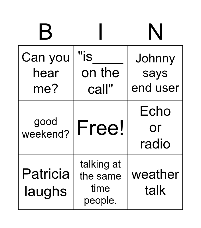 This bingo card has a free space and 9 words: Patricia laughs, Johnny says end user, "is____ on the call", good weekend?, Can you hear me?, Echo or radio, weather talk, Can you email that? and talking at the same time people..