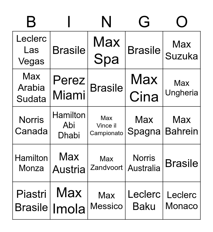 This bingo card has a free space and 29 words: Piastri Brasile, Max Silverstone, Hamilton Abi Dhabi, Perez Singapore, Leclerc Las Vegas, Max Spa, Perez Miami, Max Austria, Max Spagna, Max Imola, Max Bahrein, Leclerc Monaco, Max Messico, Leclerc Baku, Max Ungheria, Max Qatar, Max Zandvoort, Hamilton Monza, Max Suzuka, Norris Canada, Norris Australia, Max COTA, Max Cina, Max Arabia Sudata, Brasile, Brasile, Brasile, Brasile and Brasile.