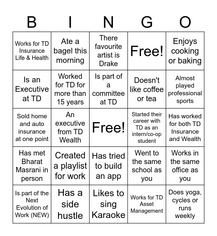 This bingo card has a free space and 29 words: Is part of the Next Evolution of Work (NEW), Is a pet owner, An executive from TD Wealth, Rides the go-train or subway to work, Works for TD Insurance Life & Health, There favourite artist is Drake, Worked for TD for more than 15 years, Created a playlist for work, Started their career with TD as an intern/co-op student, Has a side hustle, Has worked for both TD Insurance and Wealth, Does yoga, cycles or runs weekly, Likes to sing Karaoke, Works for TD Asset Management, Almost played professional sports, Started their career in the Branch as a Teller, Has tried to build an app, Has met Bharat Masrani in person, Enjoys cooking or baking, Sold home and auto insurance at one point, Went to the same school as you, Previously or currently working in Direct Investing, Doesn't like coffee or tea, Is an Executive at TD, Free!, Ate a bagel this morning, Works in the same office as you, Is part of a committee at TD and Free!.