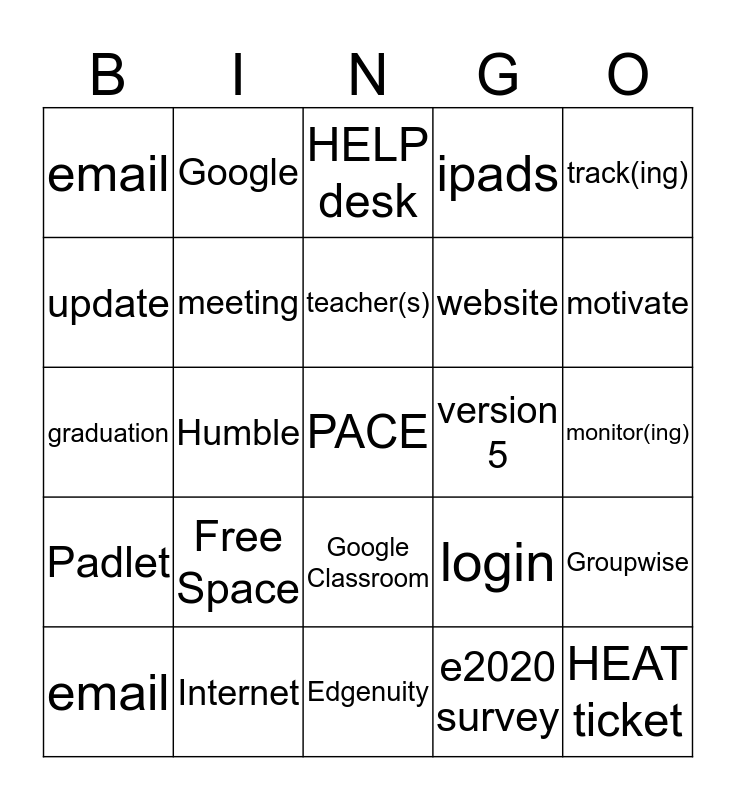 This bingo card has 25 words: Free Space, Edgenuity, teacher(s), email, track(ing), email, update, Google, version 5, Google Classroom, website, graduation, login, Groupwise, meeting, HEAT ticket, monitor(ing), HELP desk, motivate, Humble, PACE, Internet, Padlet, ipads and e2020 survey.