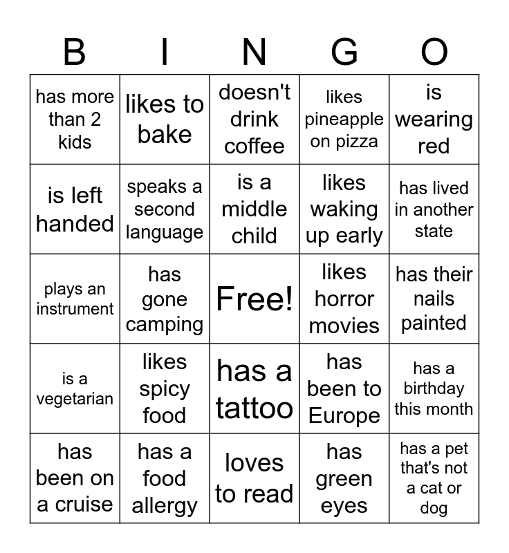 This bingo card has a free space and 24 words: likes spicy food, has a food allergy, is a middle child, has been on a cruise, is wearing red, has more than 2 kids, is left handed, likes to bake, likes horror movies, has a tattoo, likes waking up early, plays an instrument, has been to Europe, has a birthday this month, speaks a second language, has green eyes, has their nails painted, doesn't drink coffee, has lived in another state, has gone camping, has a pet that's not a cat or dog, is a vegetarian, likes pineapple on pizza and loves to read.