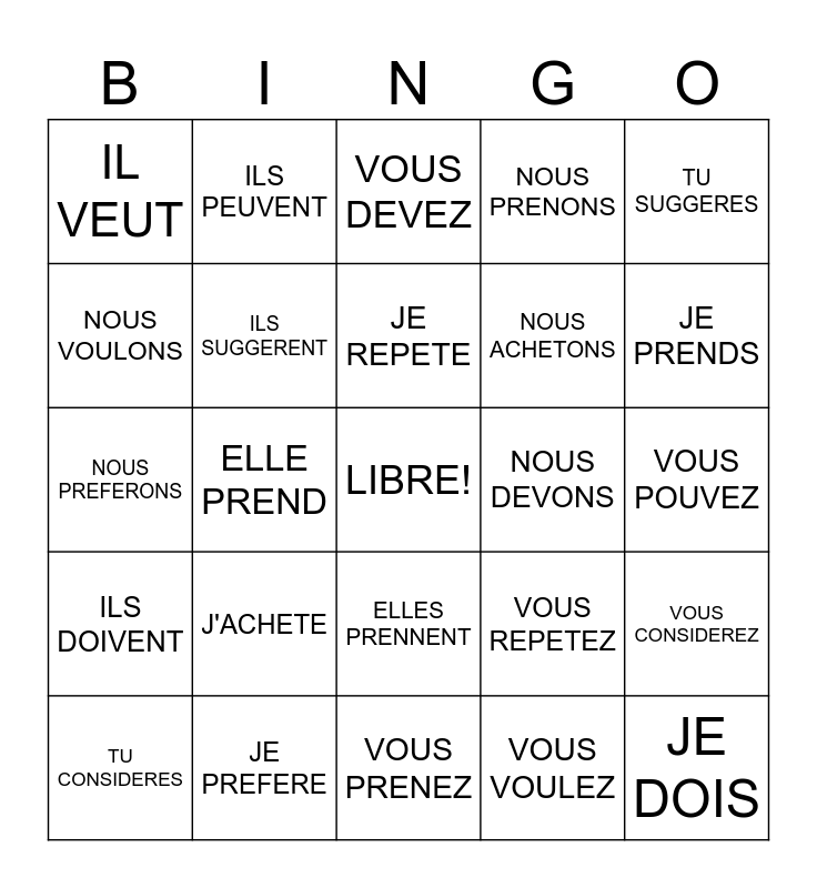 This bingo card has a free space and 24 words: J'ACHETE, JE PREFERE, JE REPETE, TU CONSIDERES, TU SUGGERES, IL VEUT, NOUS VOULONS, ILS PEUVENT, NOUS DEVONS, ELLES PRENNENT, NOUS ACHETONS, NOUS PREFERONS, VOUS REPETEZ, VOUS CONSIDEREZ, ILS SUGGERENT, VOUS VOULEZ, VOUS POUVEZ, VOUS DEVEZ, JE PRENDS, ELLE PREND, JE DOIS, ILS DOIVENT, NOUS PRENONS and VOUS PRENEZ.