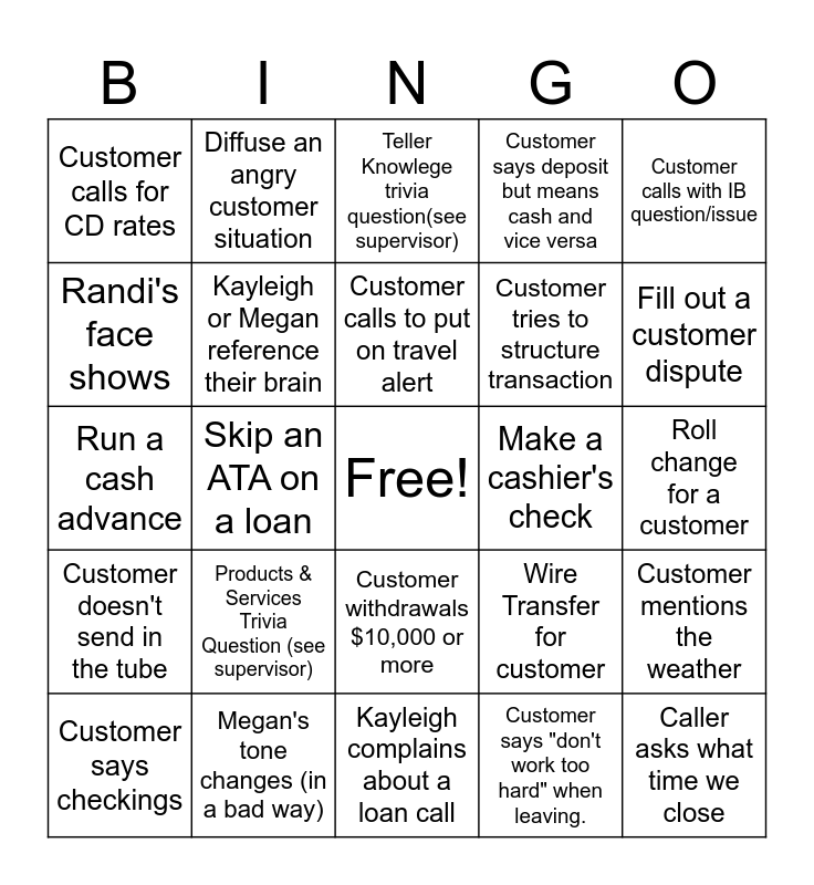 This bingo card has a free space and 24 words: Customer says checkings, Products & Services Trivia Question (see supervisor), Customer calls to put on travel alert, Customer says "don't work too hard" when leaving., Customer calls with IB question/issue, Customer calls for CD rates, Diffuse an angry customer situation, Teller Knowlege trivia question(see supervisor), Make a cashier's check, Roll change for a customer, Run a cash advance, Kayleigh or Megan reference their brain, Wire Transfer for customer, Customer mentions the weather, Randi's face shows, Megan's tone changes (in a bad way), Kayleigh complains about a loan call, Customer says deposit but means cash and vice versa, Fill out a customer dispute, Customer doesn't send in the tube, Skip an ATA on a loan, Customer withdrawals $10,000 or more, Customer tries to structure transaction and Caller asks what time we close.