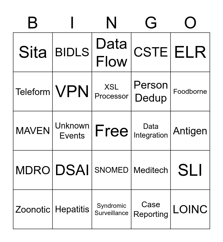 This bingo card has a free space and 44 words: STI/HIV, LOINC, COVID-19, Zoonotic, PCR, Case Reporting, Data Flow, HL7, ELR, Hepatitis, CSTE, Data Integration, SNOMED, DSAI, FHIR, Syndromic Surveillance, Vaccine Preventable Diseases, MAVEN, CDC, Foodborne, BIDLS, Health Information Reporting Portal, CLIA, Sita, Blood Culture, Antigen, EPIC, Casetivity, Meditech, MDRO, SAS, SLI, Serology, Microbiology, Unknown Events, Workflows, Persivia, Massachusetts Department of Public Health, XSL Processor, Teleform, Person Dedup, SOP, VPN and Emerging Infections.