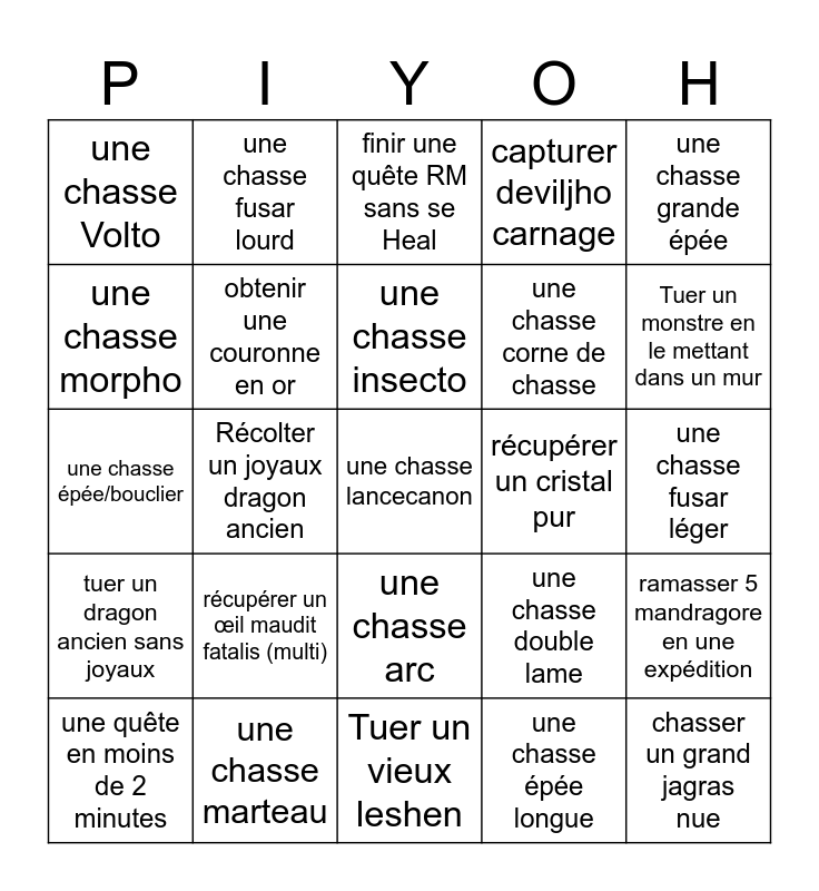 This bingo card has 26 words: une chasse arc, une chasse épée longue, une chasse insecto, une chasse marteau, une chasse grande épée, une chasse Volto, une chasse morpho, une chasse fusar lourd, une chasse fusar léger, une chasse double lame, une chasse corne de chasse, une chasse épée/bouclier, ramasser 5 mandragore en une expédition, une quête en moins de 2 minutes, Récolter un joyaux dragon ancien, une chasse lance, capturer deviljho carnage, tuer un dragon ancien sans joyaux, finir une quête RM sans se Heal, une chasse lancecanon, Tuer un monstre en le mettant dans un mur, Tuer un vieux leshen, récupérer un cristal pur, récupérer un œil maudit fatalis (multi), obtenir une couronne en or and chasser un grand jagras nue.