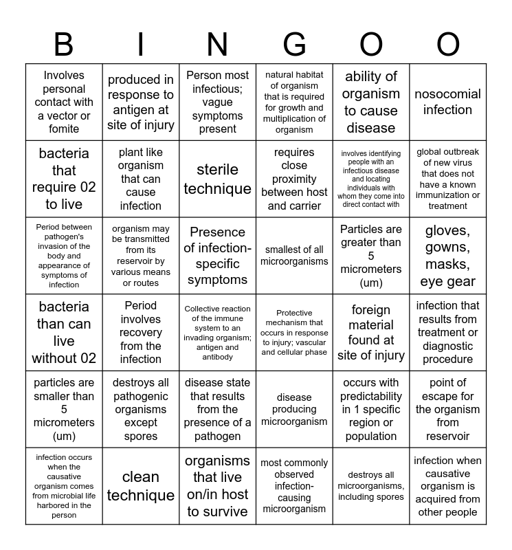 This bingo card has 36 words: disease producing microorganism, disease state that results from the presence of a pathogen, most commonly observed infection-causing microorganism, bacteria that require 02 to live, bacteria than can live without 02, smallest of all microorganisms, plant like organism that can cause infection, organisms that live on/in host to survive, ability of organism to cause disease, occurs with predictability in 1 specific region or population, global outbreak of new virus that does not have a known immunization or treatment, natural habitat of organism that is required for growth and multiplication of organism, point of escape for the organism from reservoir, organism may be transmitted from its reservoir by various means or routes, requires close proximity between host and carrier, Involves personal contact with a vector or fomite, particles are smaller than 5 micrometers (um), Particles are greater than 5 micrometers (um), Period between pathogen's invasion of the body and appearance of symptoms of infection, Person most infectious; vague symptoms present, Presence of infection-specific symptoms, Period involves recovery from the infection, Protective mechanism that occurs in response to injury; vascular and cellular phase, Collective reaction of the immune system to an invading organism; antigen and antibody, foreign material found at site of injury, produced in response to antigen at site of injury, involves identifying people with an infectious disease and locating individuals with whom they come into direct contact with, clean technique, sterile technique, nosocomial infection, infection when causative organism is acquired from other people, infection occurs when the causative organism comes from microbial life harbored in the person, infection that results from treatment or diagnostic procedure, gloves, gowns, masks, eye gear, destroys all pathogenic organisms except spores and destroys all microorganisms, including spores.