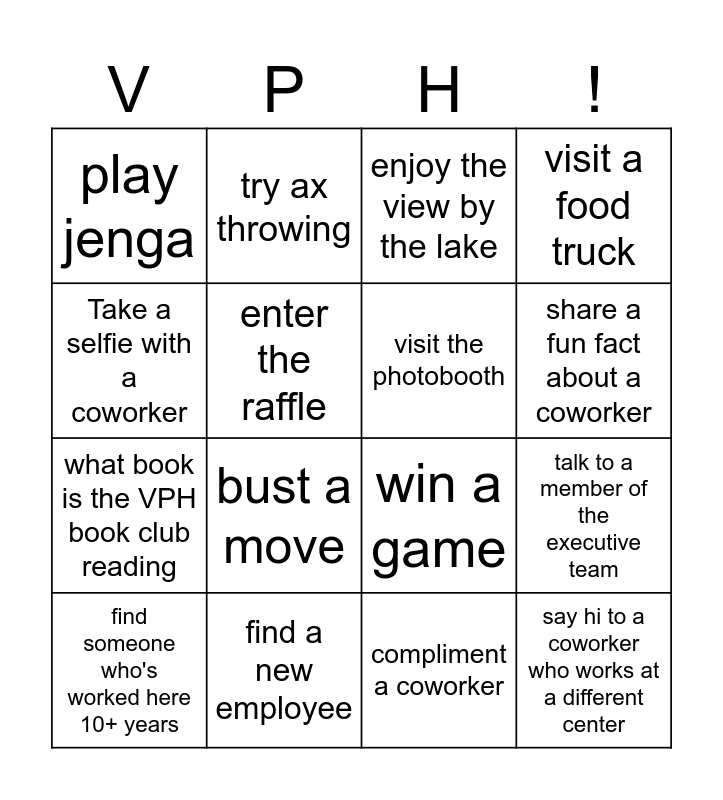 This bingo card has 16 words: find a new employee, talk to a member of the executive team, enjoy the view by the lake, play jenga, what book is the VPH book club reading, try ax throwing, win a game, compliment a coworker, Take a selfie with a coworker, enter the raffle, find someone who's worked here 10+ years, visit a food truck, bust a move, share a fun fact about a coworker, visit the photobooth and say hi to a coworker who works at a different center.