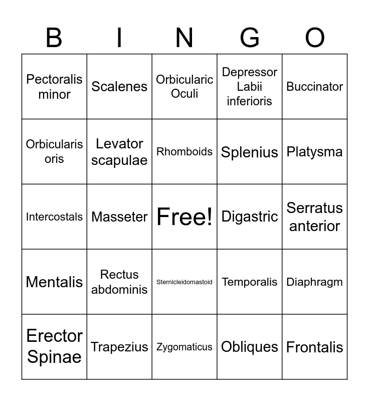 This bingo card has a free space and 24 words: Rectus abdominis, Trapezius, Rhomboids, Erector Spinae, Buccinator, Pectoralis minor, Orbicularis oris, Scalenes, Digastric, Sternlcleidomastoid, Splenius, Intercostals, Temporalis, Diaphragm, Levator scapulae, Obliques, Serratus anterior, Orbicularic Oculi, Platysma, Masseter, Frontalis, Mentalis, Depressor Labii inferioris and Zygomaticus.