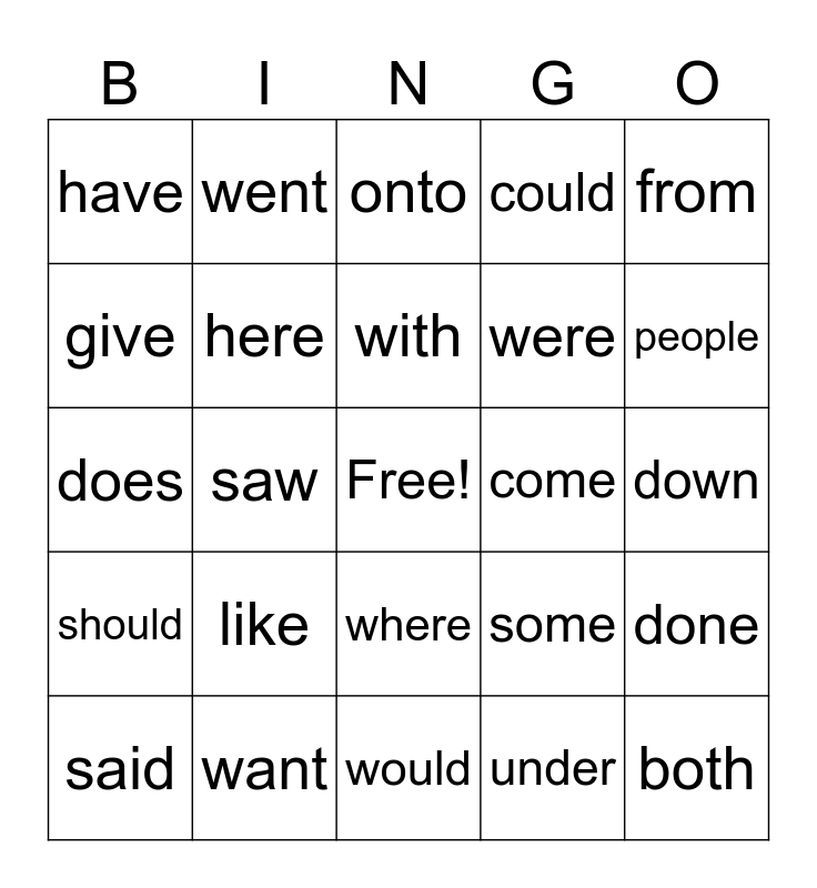 This bingo card has a free space and 24 words: like, want, with, said, from, have, give, went, come, where, were, does, some, done, here, under, down, onto, people, saw, both, should, could and would.