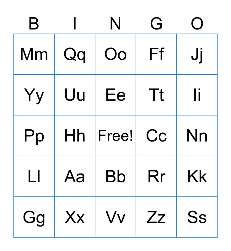 This bingo card has a free space and 24 words: Aa, Xx, Ee, Gg, Jj, Mm, Yy, Qq, Cc, Bb, Tt, Pp, Rr, Kk, Uu, Zz, Nn, Oo, Ii, Hh, Ss, Ll, Ff and Vv.