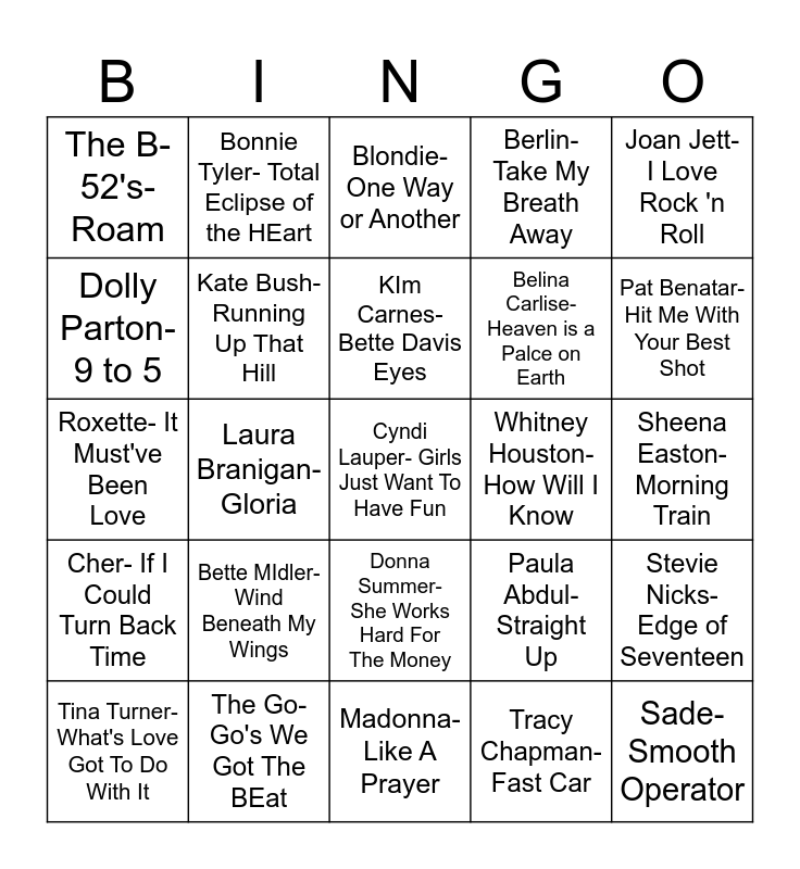 This bingo card has 28 words: Stevie Nicks- Edge of Seventeen, The Bangles- Walk Like An Eygptian, Belina Carlise- Heaven is a Palce on Earth, Tracy Chapman- Fast Car, Dolly Parton- 9 to 5, Blondie- One Way or Another, Bonnie Tyler- Total Eclipse of the HEart, Cher- If I Could Turn Back Time, Whitney Houston- How Will I Know, Tina Turner- What's Love Got To Do With It, Roxette- It Must've Been Love, Berlin- Take My Breath Away, The Go-Go's We Got The BEat, Madonna- Like A Prayer, Pat Benatar- Hit Me With Your Best Shot, Deniece Williams- Let's Hear It For The Boys, Bette MIdler- Wind Beneath My Wings, Kate Bush- Running Up That Hill, KIm Carnes- Bette Davis Eyes, Donna Summer- She Works Hard For The Money, The B-52's- Roam, Sade- Smooth Operator, Cyndi Lauper- Girls Just Want To Have Fun, Laura Branigan- Gloria, Sheena Easton- Morning Train, Paula Abdul- Straight Up, Joan Jett- I Love Rock 'n Roll and Diana Ross- I'm Coming Out.