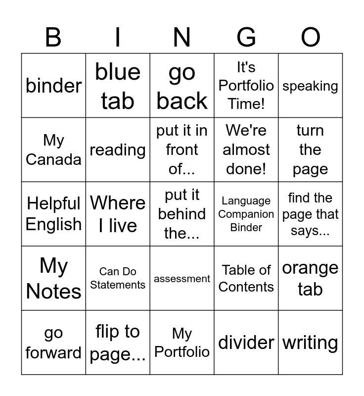 This bingo card has a free space and 29 words: go forward, open to page..., Where I live, listening, binder, go back, reading, Can Do Statements, Language Companion Binder, flip to page..., find the page that says..., writing, My Portfolio, divider, turn the page, inventory page, assessment, My Notes, speaking, Helpful English, Table of Contents, section, We're almost done!, My Canada, It's Portfolio Time!, blue tab, orange tab, put it in front of... and take out.