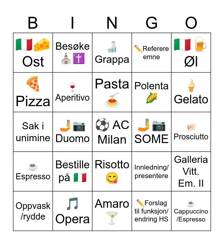 This bingo card has 25 words: Bestille på 🇮🇹, Amaro 🍸, Pasta 🍝, Oppvask /rydde, 🇮🇹🍺 Øl, 🇮🇹🧀 Ost, 🍕Pizza, Besøke ⛪✝️, 🤳📷 SOME, Risotto😋, Polenta🌽, Sak i unimine, Innledning/ presentere, Galleria Vitt. Em. II, 🍷Aperitivo, ☕ Cappuccino /Espresso, 🐖Prosciutto, 🍶Grappa, 🍦Gelato, 🤳📷 Duomo, ⚽ AC Milan, 🎵 Opera, ☕Espresso, ✏️Referere emne and ✏️Forslag til funksjon/ endring HS.