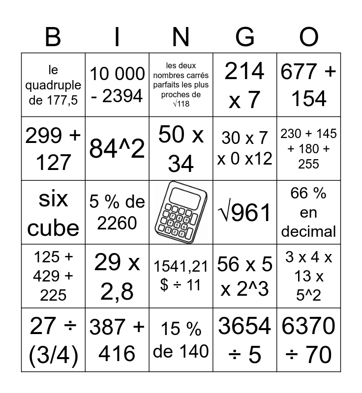 This bingo card has a free space and 49 words: 75 x 3,6, 6370 ÷ 70, les deux nombres carrés parfaits les plus proches de √70, 15 % de 140, 29 x 2,8, 18 ÷ (2/3), 10 000 - 2394, 1300 - 425, 299 + 127, 121 x 11, 84^2, 214 x 7, 3 x 4 x 13 x 5^2, 56 x 5 x 2^3, [(3^10)^0]^2, √289, 50 x 34, √961, 65^2, 677 + 154, 5 % de 2260, 3654 ÷ 5, le quadruple de 177,5, 30 x 7 x 0 x12, 19 x 6 x 0 x 4 x 5, 230 + 145 + 180 + 255, 27 ÷ (3/4), 75 x 12 x 3^2, 1541,21 $ ÷ 11, 125 + 429 + 225, √9, 23 % de 5027, √1, 37 % de 429, 387 + 416, -10 + (-20), le double de 527,2, 45 x 18, 66 % en decimal, 12 + 14,5, (-9)^5 x (-9)^4 / (-9)^3, (3^4)^2, -17^0, 7 x 8 x 50, six cube, les deux nombres carrés parfaits les plus proches de √118, 8^18 / 4^5, 7629,29 + 9401,7 and 3.14 en fraction.