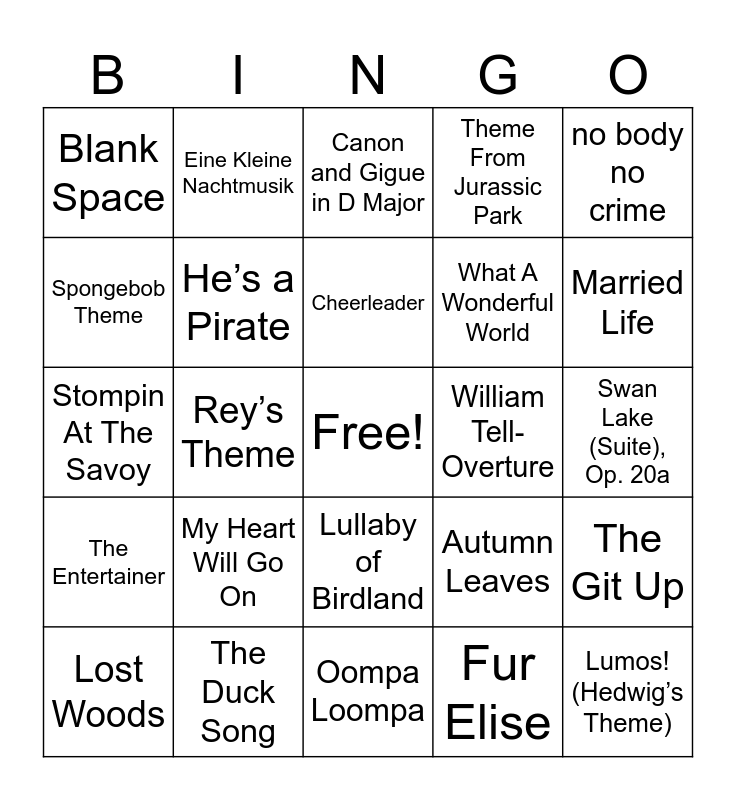 This bingo card has a free space and 25 words: My Heart Will Go On, Oompa Loompa, Cheerleader, Lost Woods, no body no crime, Blank Space, Spongebob Theme, Eine Kleine Nachtmusik, William Tell-Overture, Lullaby of Birdland, What A Wonderful World, Stompin At The Savoy, Autumn Leaves, The Git Up, He’s a Pirate, Merry-Go-Round of Life, Swan Lake (Suite), Op. 20a, Canon and Gigue in D Major, Married Life, Rey’s Theme, Lumos! (Hedwig’s Theme), The Duck Song, The Entertainer, Theme From Jurassic Park and Fur Elise.