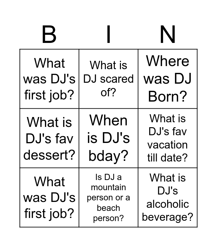 This bingo card has a free space and 38 words: Where was DJ Born?, Where did DJ go to school?, Who is DJ's fav musician?, What was DJ's first job?, What is DJ's fav sport?, Where did DJ go to for his master's?, Is DJ a mountain person or a beach person?, Is DJ a coffee person or a tea person?, What is DJ's alcoholic beverage?, How many US states has DJ visited?, How many Indian states has DJ visited?, What is DJ's fav dessert?, How many siblings does DJ have?, Has DJ ever flown business class?, What is DJ's fav vacation till date?, What is DJ scared of?, What is DJ's favorite color?, Where was DJ Born?, Where did DJ go to school?, Who is DJ's fav musician?, What was DJ's first job?, Where did DJ go to for his master's?, When is DJ's bday?, What is DJ's fav sport?, Is DJ a mountain person or a beach person?, Is DJ a coffee person or a tea person?, What is DJ's alcoholic beverage?, How many US states has DJ visited?, How many Indian states has DJ visited?, What is DJ's fav dessert?, How many siblings does DJ have?, Has DJ ever flown business class?, What is DJ's fav vacation till date?, What is DJ scared of?, What is DJ's favorite color?, What age did DJ meet Swapna?, Which company was DJ in before BOX? and What is DJ's most favorite thing to eat?(Can be more than one answer).