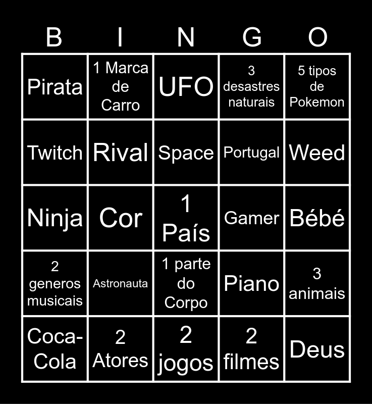 This bingo card has a free space and 24 words: Astronauta, 2 Atores, Space, Coca-Cola, 5 tipos de Pokemon, Pirata, Twitch, 1 Marca de Carro, Gamer, 1 parte do Corpo, Portugal, Ninja, Piano, 3 animais, Rival, 2 filmes, Bébé, UFO, Weed, Cor, Deus, 2 generos musicais, 3 desastres naturais and 2 jogos.