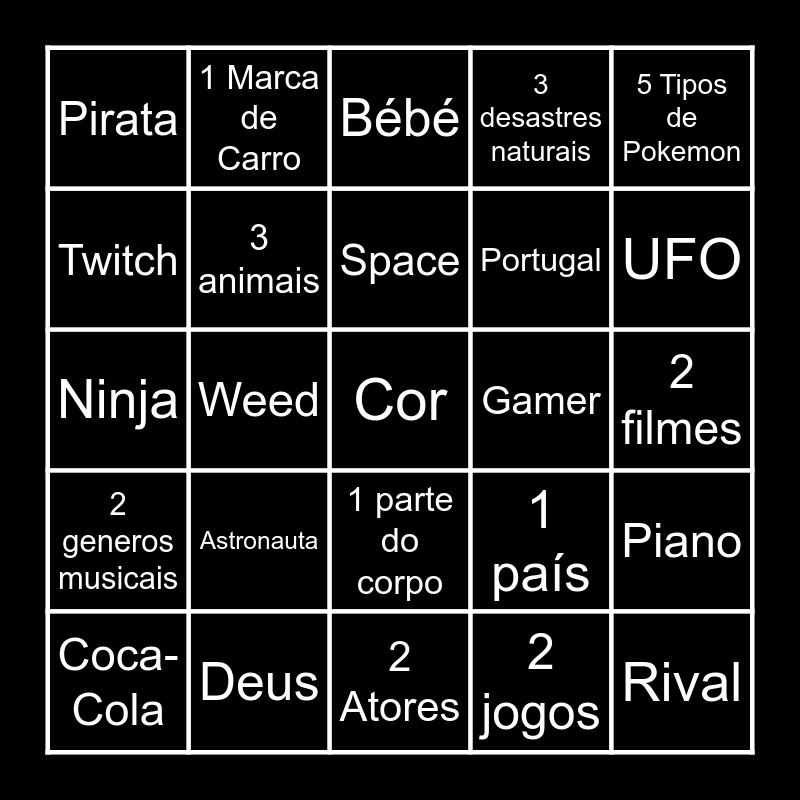 This bingo card has 25 words: Astronauta, 2 Atores, Space, Coca-Cola, 5 Tipos de Pokemon, Pirata, Twitch, 1 Marca de Carro, Gamer, 1 parte do corpo, Portugal, Ninja, 1 país, Piano, 3 animais, Rival, 2 filmes, Bébé, UFO, Weed, Cor, Deus, 2 generos musicais, 3 desastres naturais and 2 jogos.