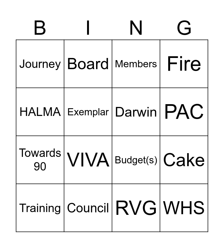 This bingo card has 24 words: Free!, Past President, PAC, EAC, HALMA, Journey, Exemplar, Board, Council, President, Towards 90, Budget(s), ASURA, NSC, Darwin, E-news, RVG, Members, VIVA, Cake, Training, WHS, Fire and Australian Anaesthetist Magazine.