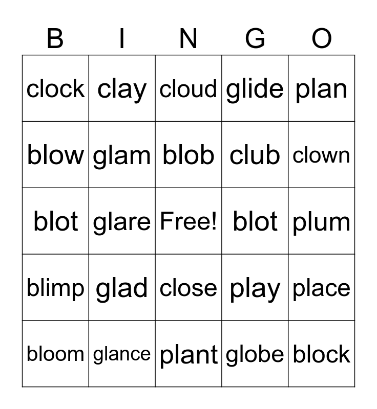 This bingo card has a free space and 50 words: black, block, plane, plant, glad, glass, clay, clean, blow, blue, glam, glide, place, play, clam, clap, blob, blot, plug, plan, glare, globe, clock, club, class, cliff, clown, clue, cloud, close, closet, claw, glen, glove, glance, glam, gloss, plus, plank, plum, please, plug, blanket, bled, bloom, blot, blast, blush, blimp and blog.