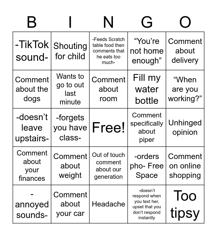 This bingo card has a free space and 25 words: Comment about weight, Headache, Comment about room, -annoyed sounds-, Comment about delivery, -TikTok sound-, Comment about the dogs, Shouting for child, Comment specifically about piper, Out of touch comment about our generation, Fill my water bottle, -doesn’t leave upstairs-, -orders pho- Free Space, Comment on online shopping, Wants to go to out last minute, Annoyed about going out last minute, Unhinged opinion, -Feeds Scratch table food then comments that he eats too much-, “When are you working?”, -forgets you have class-, Too tipsy, Comment about your car, Comment about your finances, “You’re not home enough” and -doesn’t respond when you text her, upset that you don’t respond instantly.