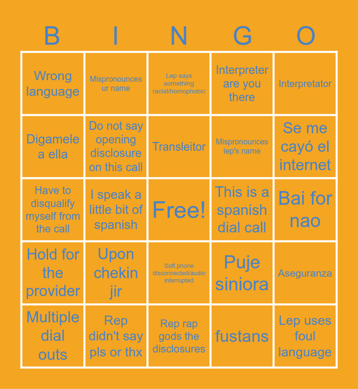 This bingo card has a free space and 24 words: Upon chekin jir, Rep didn't say pls or thx, Transleitor, Multiple dial outs, Interpretator, Wrong language, Digamele a ella, Mispronounces ur name, This is a spanish dial call, Soft phone disconnected/audio interrupted, Mispronounces lep's name, Have to disqualify myself from the call, Puje siniora, Aseguranza, Do not say opening disclosure on this call, fustans, Bai for nao, Lep says something racist/homophobic, Se me cayó el internet, I speak a little bit of spanish, Lep uses foul language, Hold for the provider, Interpreter are you there and Rep rap gods the disclosures.