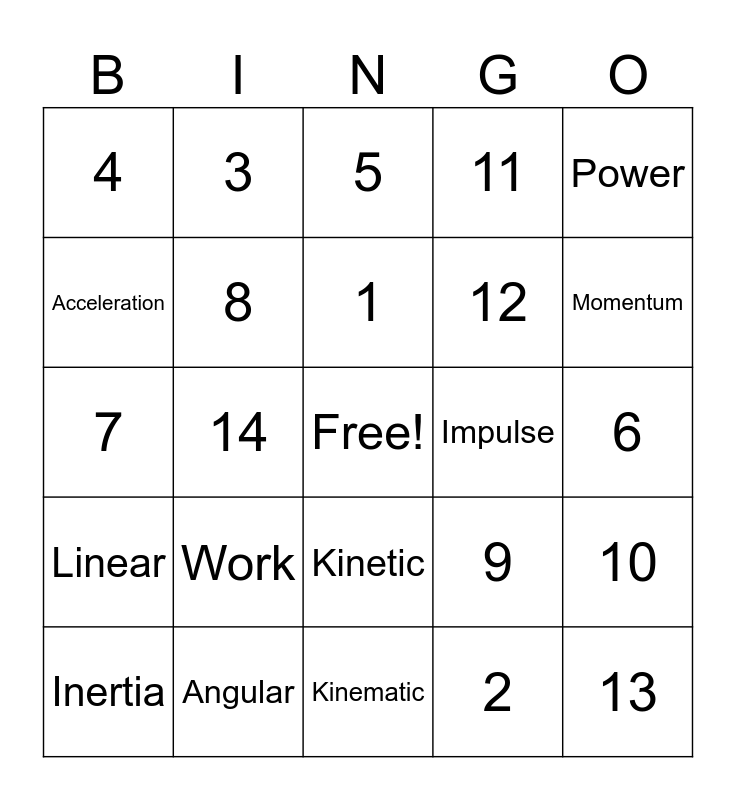 This bingo card has a free space and 24 words: Inertia, Work, 1, 2, Power, 4, 3, 5, Impulse, 6, 7, 8, 9, 10, Acceleration, Angular, Kinematic, 11, Momentum, Linear, 14, Kinetic, 12 and 13.
