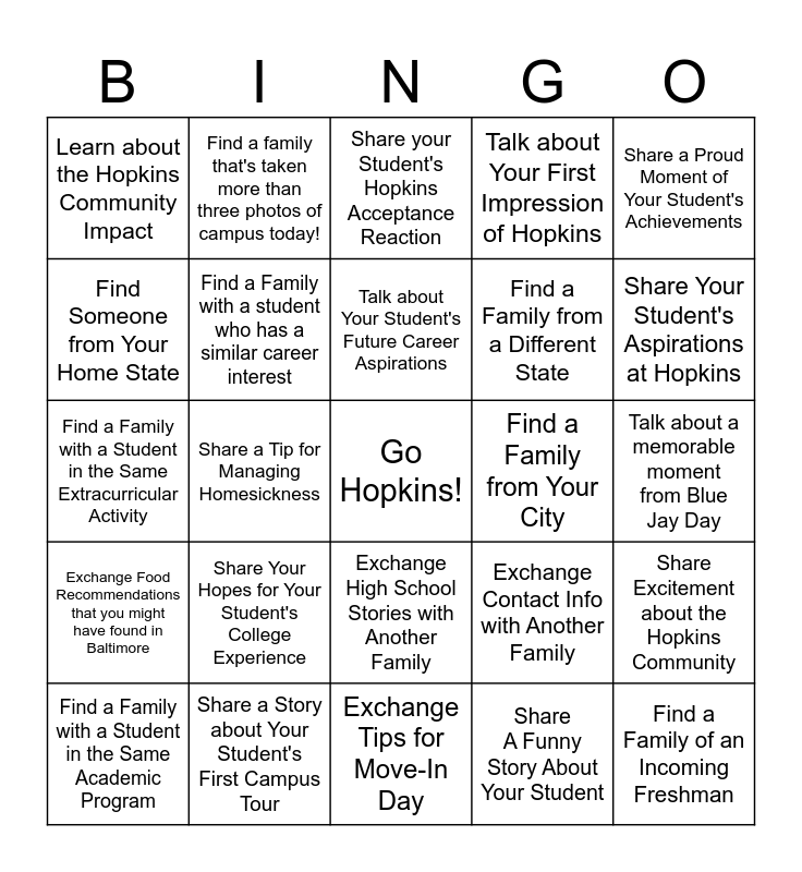 This bingo card has a free space and 24 words: Find a Family with a Student in the Same Academic Program, Share Your Hopes for Your Student's College Experience, Talk about Your Student's Future Career Aspirations, Share A Funny Story About Your Student, Share a Proud Moment of Your Student's Achievements, Learn about the Hopkins Community Impact, Find a family that's taken more than three photos of campus today!, Share your Student's Hopkins Acceptance Reaction, Find a Family from Your City, Talk about a memorable moment from Blue Jay Day, Find a Family with a Student in the Same Extracurricular Activity, Find a Family with a student who has a similar career interest, Exchange Contact Info with Another Family, Share Excitement about the Hopkins Community, Find Someone from Your Home State, Share a Story about Your Student's First Campus Tour, Exchange Tips for Move-In Day, Talk about Your First Impression of Hopkins, Share Your Student's Aspirations at Hopkins, Exchange Food Recommendations that you might have found in Baltimore, Share a Tip for Managing Homesickness, Exchange High School Stories with Another Family, Find a Family from a Different State and Find a Family of an Incoming Freshman.